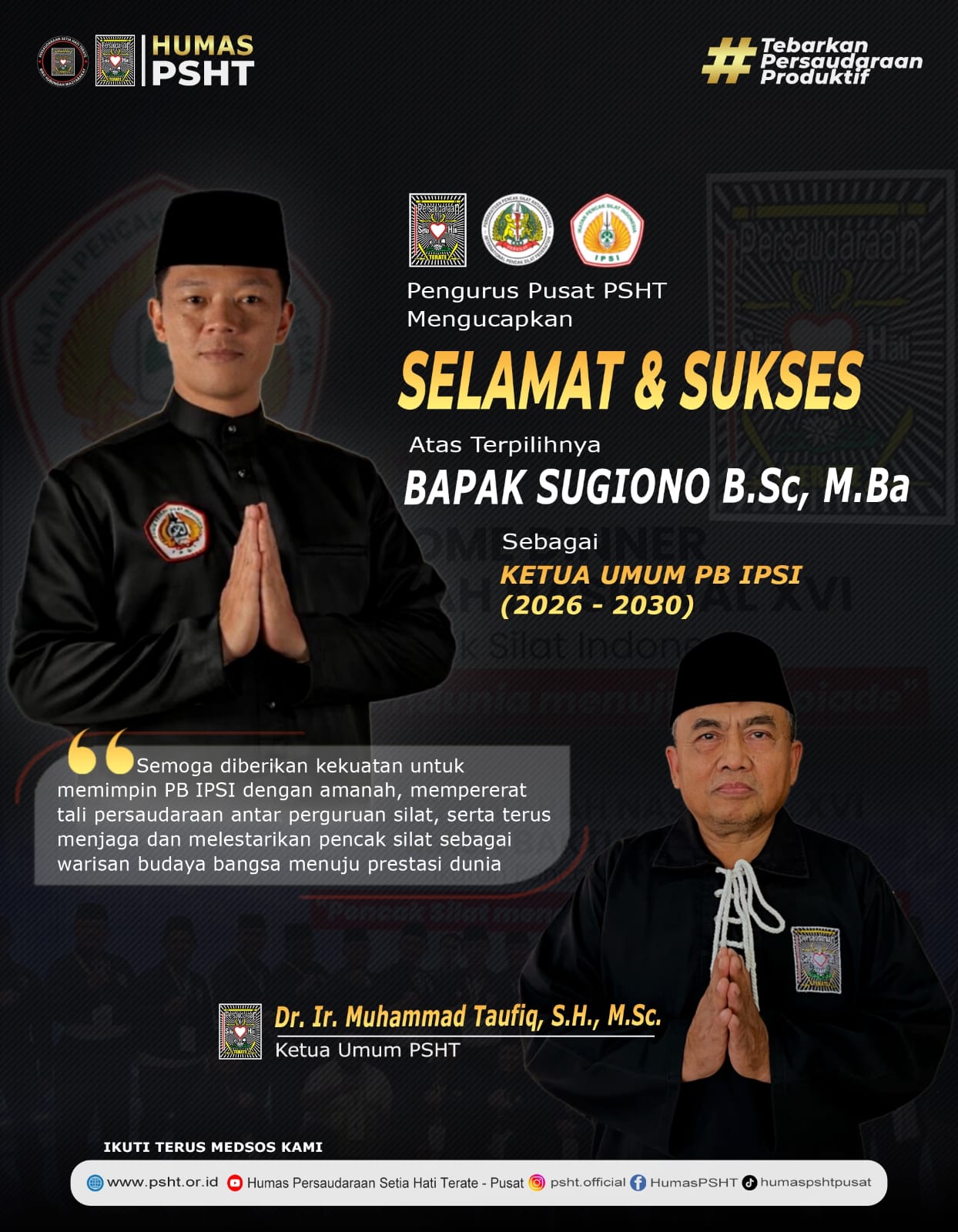 Ketua Cabang PSHT Kabupaten Blitar, Tugas Nanggolo Yudo Dili Prasetiono, menyampaikan ucapan selamat dan sukses atas terpilihnya Sugiono B.Sc., M.BA sebagai Ketua Umum PB IPSI periode 2026–2030.