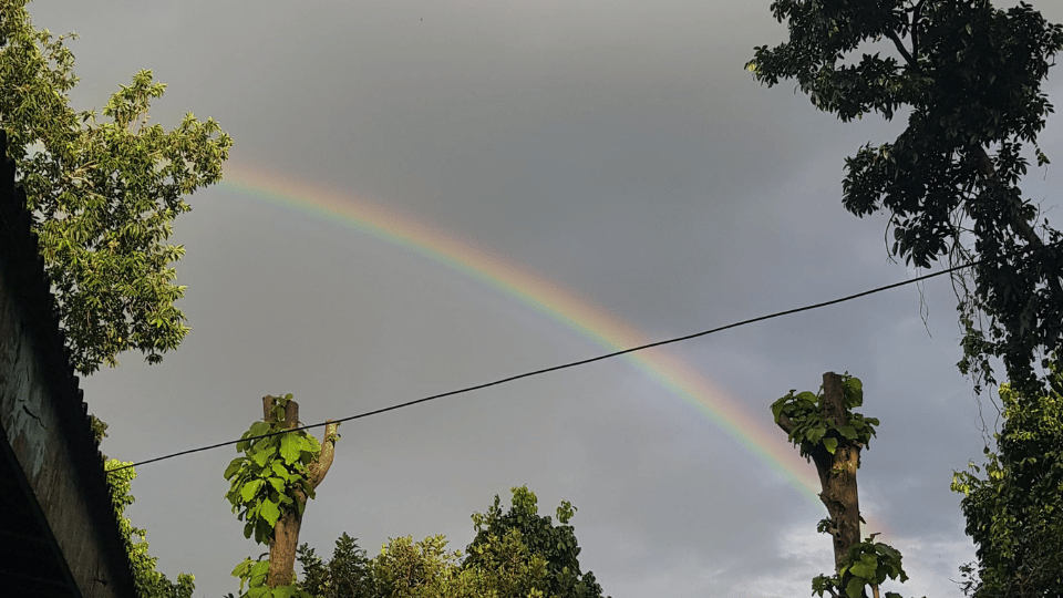 “Tadi hujannya lumayan deras sejak jam dua siang, tapi pas reda sekitar setengah lima, tiba-tiba langit sebelah timur cerah dan muncul pelangi besar sekali. Warnanya sangat jelas, merah hijaunya kelihatan kontras dengan sisa awan mendung di belakangnya,” ungkap Nanada Saniyaroh sembari menunjukkan hasil jepretan fotonya.
