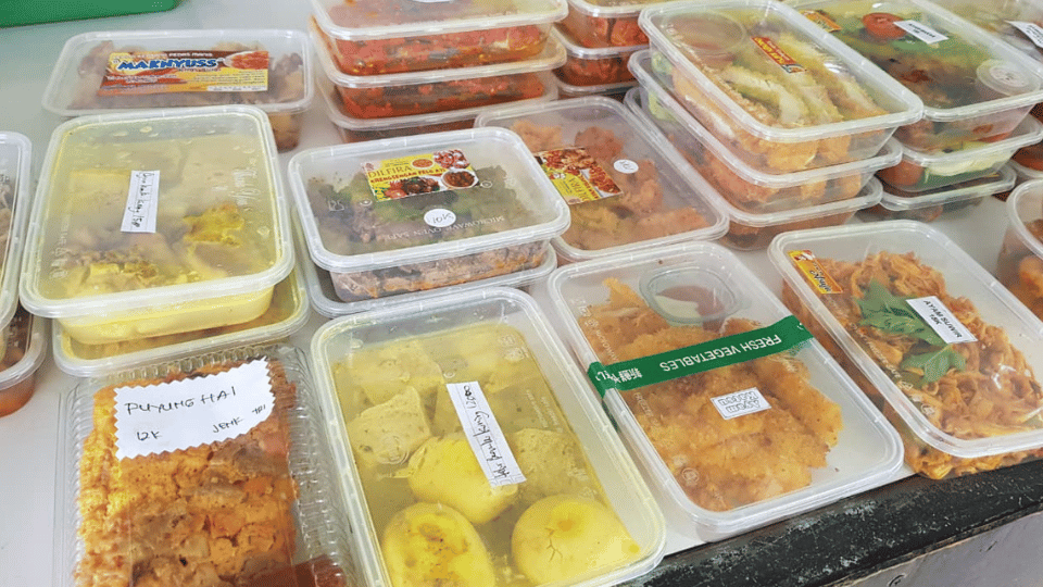 Beragam jenis makanan siap saji ditawarkan, mulai dari nasi bungkus, lauk matang, aneka gorengan, hingga makanan kekinian seperti ayam krispi, sosis bakar, dan dimsum.