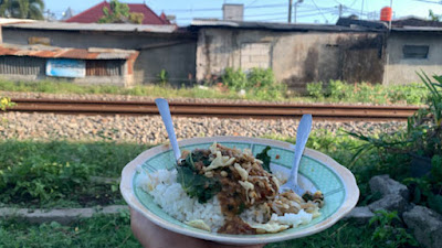 Berlokasi persis di tepi jalur kereta api, warung sederhana ini menawarkan sensasi kuliner khas Blitar yang unik: makan nasi pecel tumpang sambil menyaksikan kereta lewat dari dekat.