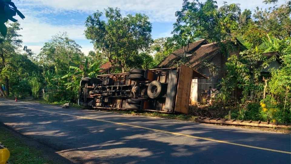 Pantauan di lapangan menunjukkan, truk berwarna kuning itu berada dalam posisi miring di sisi jalan dengan kondisi sebagian badan kendaraan mengarah ke bahu jalan. Muatan tebu yang diangkut tampak berserakan di sekitar lokasi.